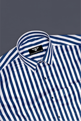 Step into refined elegance with our Regal Blue and Bright White Striped designer shirt. The subtle sheen accentuates the timeless stripes on the canvas of super-soft premium cotton. Enjoy regal comfort and impeccable style, making this shirt a classic essential that effortlessly combines sophistication with modern charm.